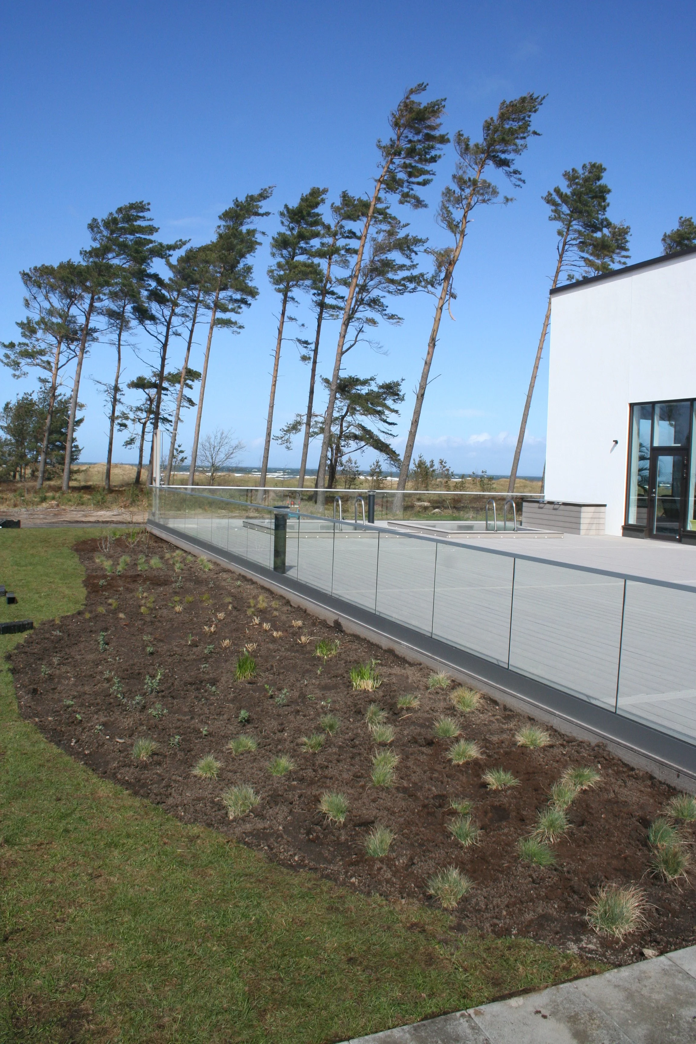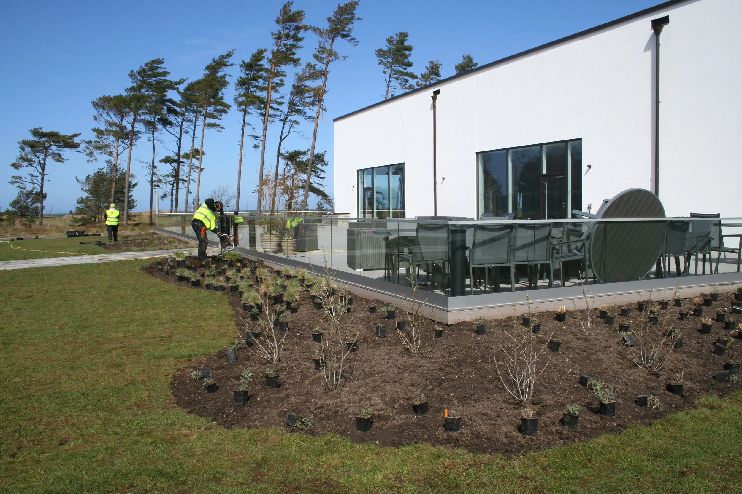 Idén för denna trädgård var att använda inhemska växter som växer naturligt längs kusten där Hotel Riviera ligger. Här hittar du havtorn, prydnadsgräs som blåsvingel och till och med timjan.